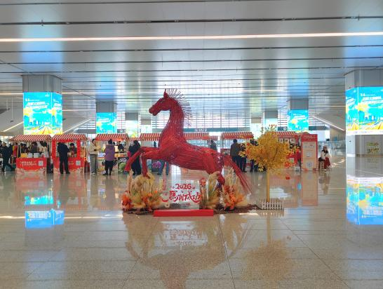 站房中庭高悬喜庆灯笼,北通廊陈列非遗红马,文化长廊点缀马年主题装饰,琴岛区域更换时花 530 余盆,更换大型花卉 20余盆,“零米层”10 个坐凳造景全部根据春节氛围进行了更新,将传统文化韵味与红色服务初心深度融合,打造出一道亮丽的“红色风景线”,让旅客在匆匆归途中切实感受到“家”的温暖与关怀。