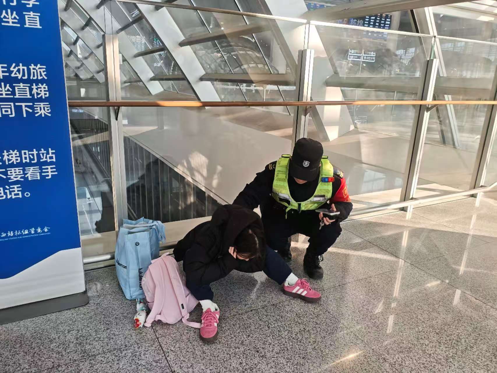 当天,秩序队员在四楼西长扶梯值守时,发现一名旅客面色苍白、神情痛苦,疑似突发身体不适,队员立即上报指挥中心并联动附近巡逻岗队员迅速赶赴现场。经询问得知,该旅客因低血糖引发头晕、恶心。队员随即联系值班医生,医生到场测出旅客血糖偏低,并现场喂服糖水帮助旅客缓解症状。