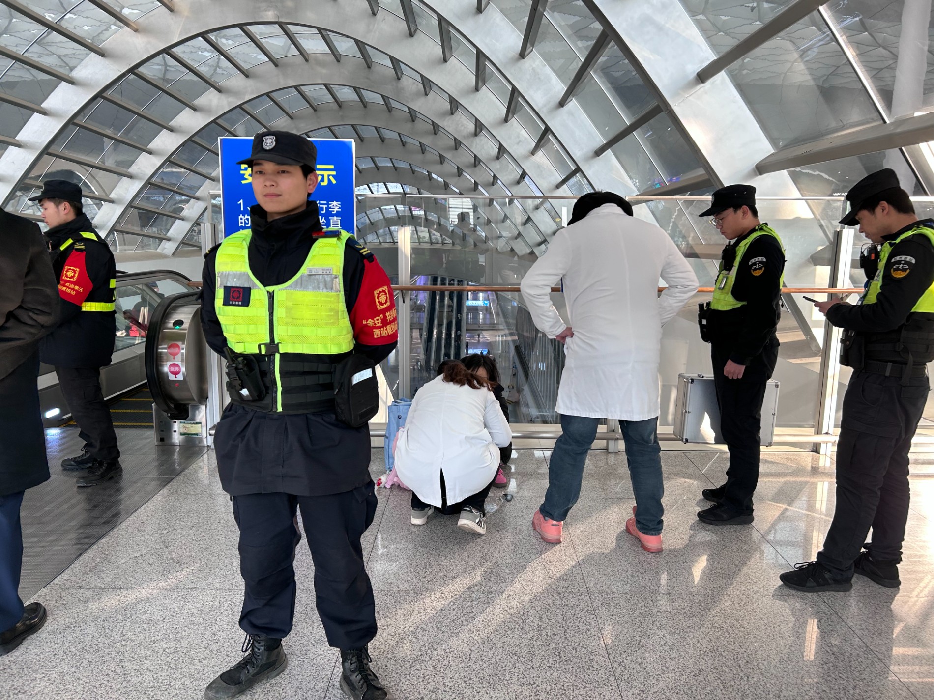 1月3日下午,中节能物业杭州西站项目服务区域内上演了一幕温情满满的救助场景。秩序队员在执勤过程中及时发现并救助了一名身体不适的旅客,凭借快速响应的处置能力与协同联动的服务意识,及时伸出援手,用专业与关怀为旅客筑牢安全防线。