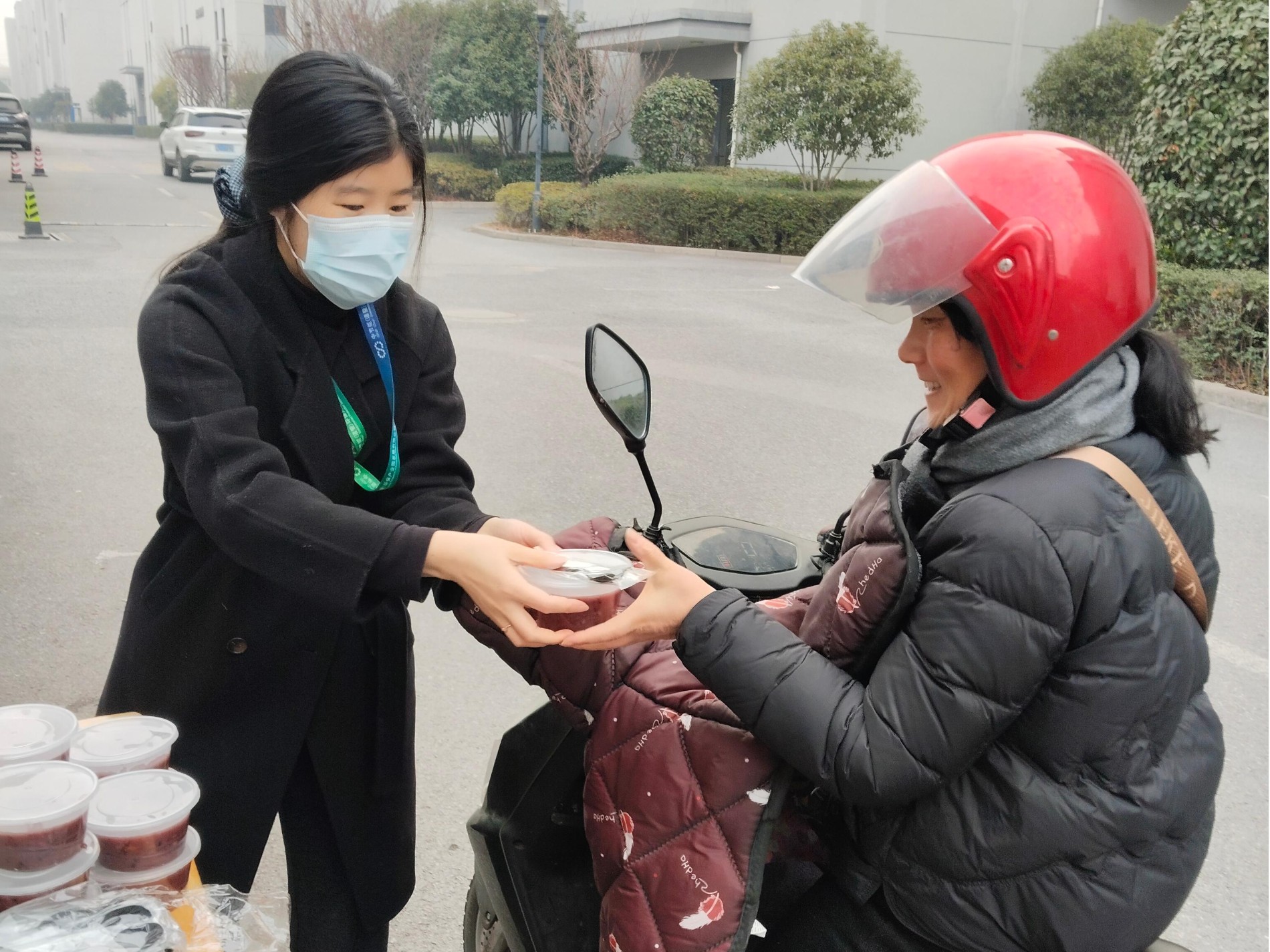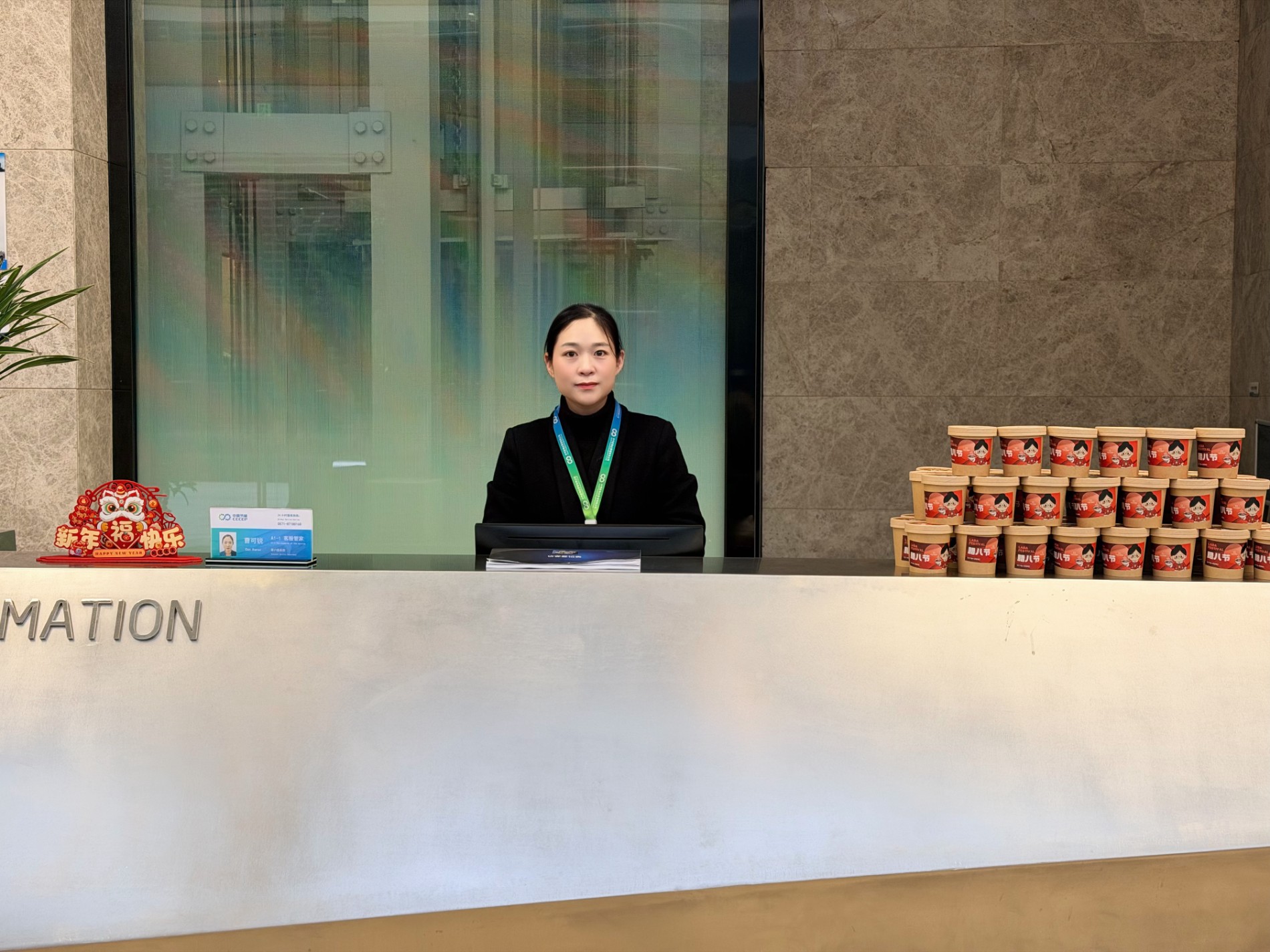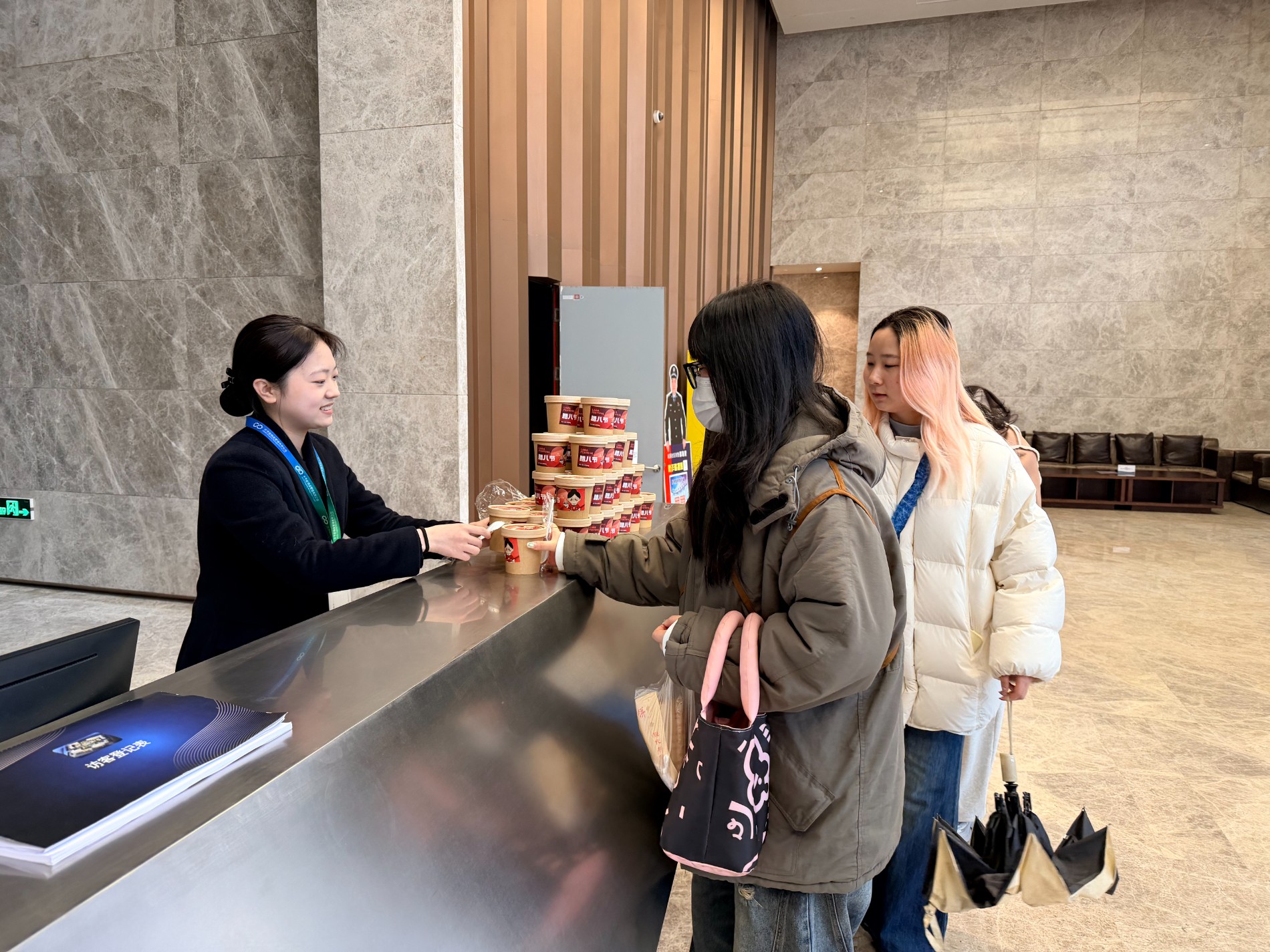 腊八当天,园区各大堂早早布置完毕。红枣、桂圆、糯米、红豆等食材熬煮的腊八粥,分装在小碗中。随着上班人流渐多,大堂管家们面带笑容递出腊八粥,亲切问候“腊八快乐,喝碗粥暖和一下”。
