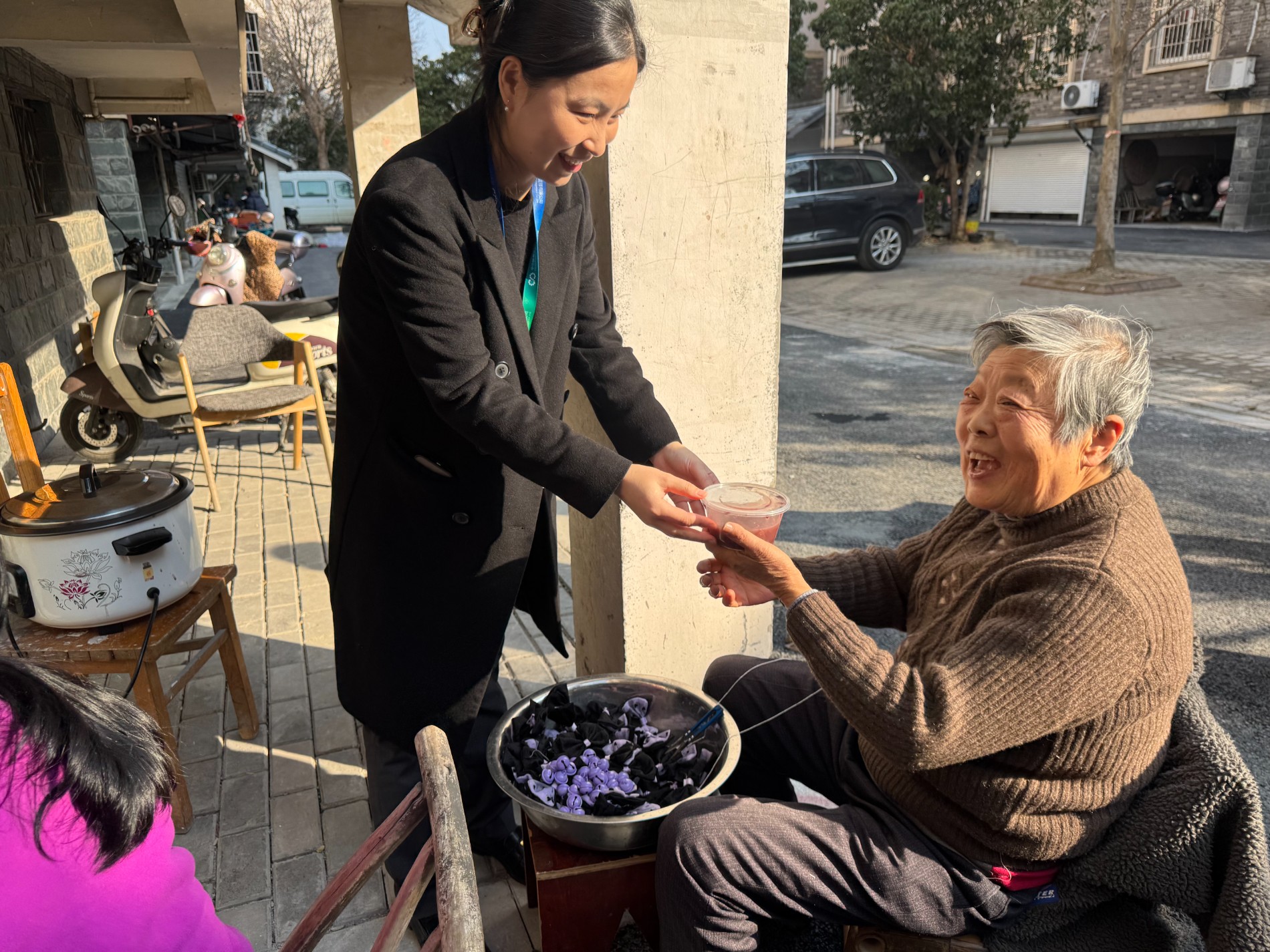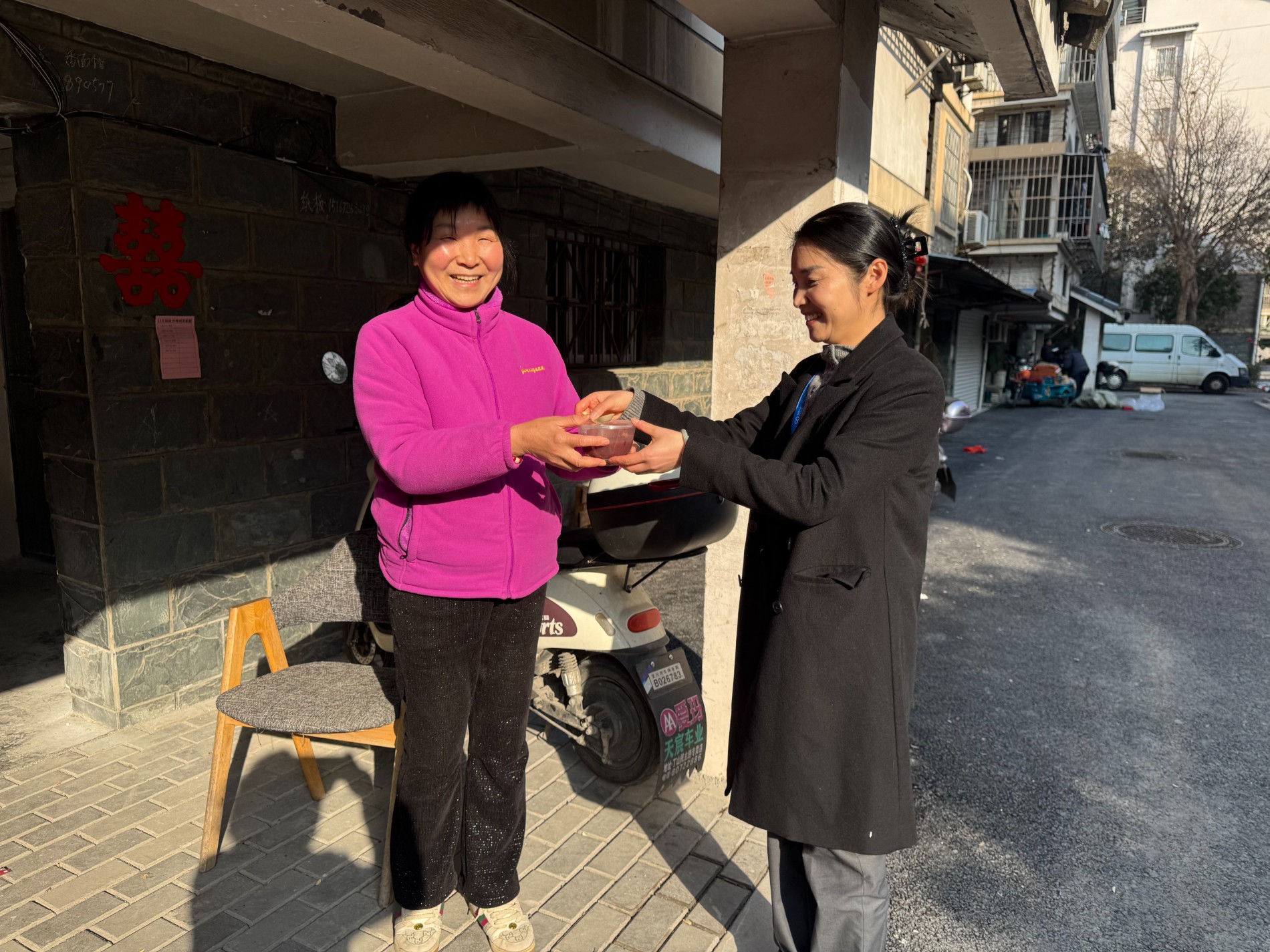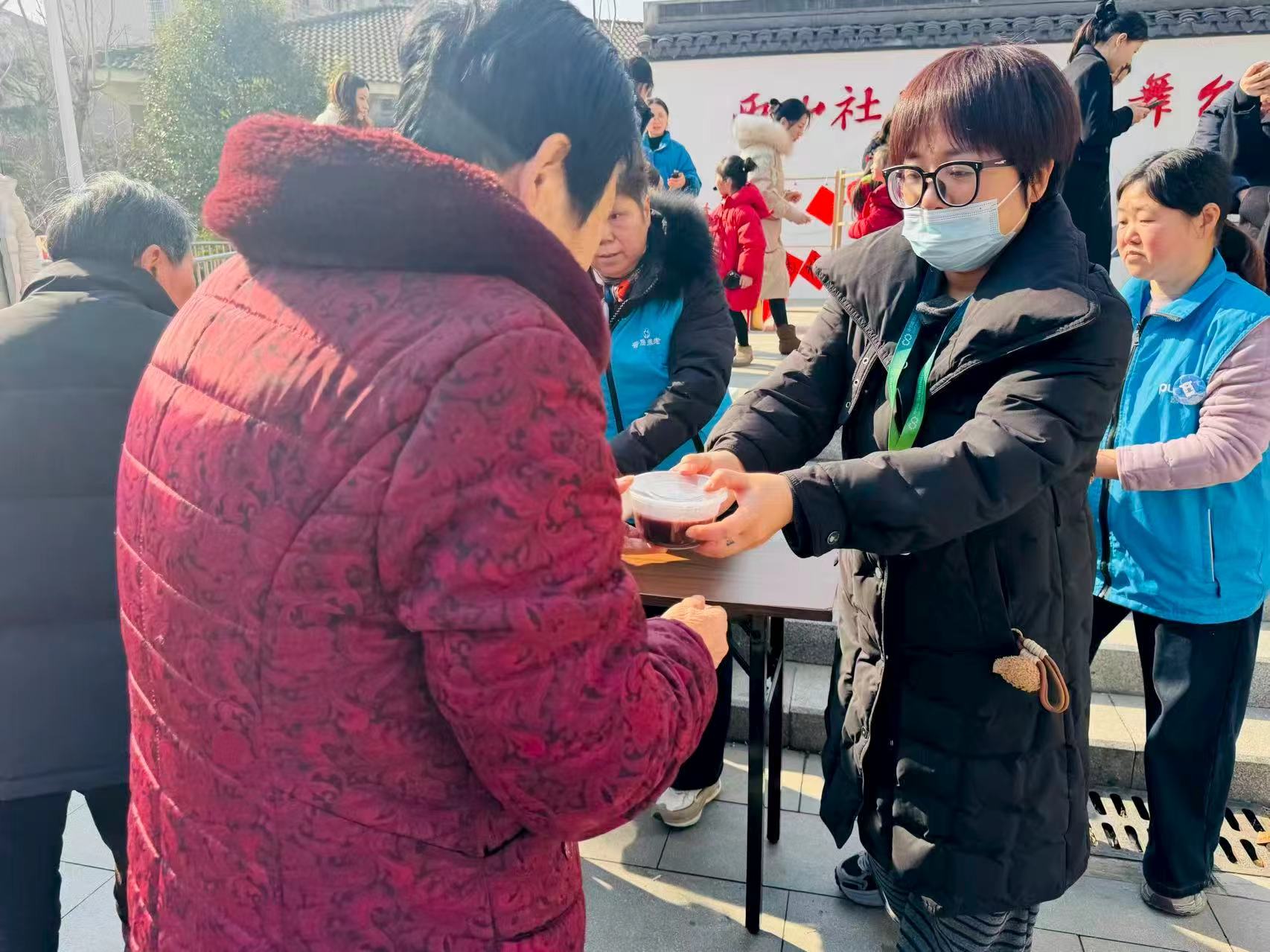 活动结束后,乐寿康养主动组成慰问队伍,携带腊八粥和福字,逐一走访辖区高龄老人。每到一户,工作人员与老人亲切交谈,详细询问其身体状况与生活需求,叮嘱老人注意冬季防寒保暖,并将软糯香甜的腊八粥递到老人手中,让老人在传统节日里感受社区的牵挂与温暖。