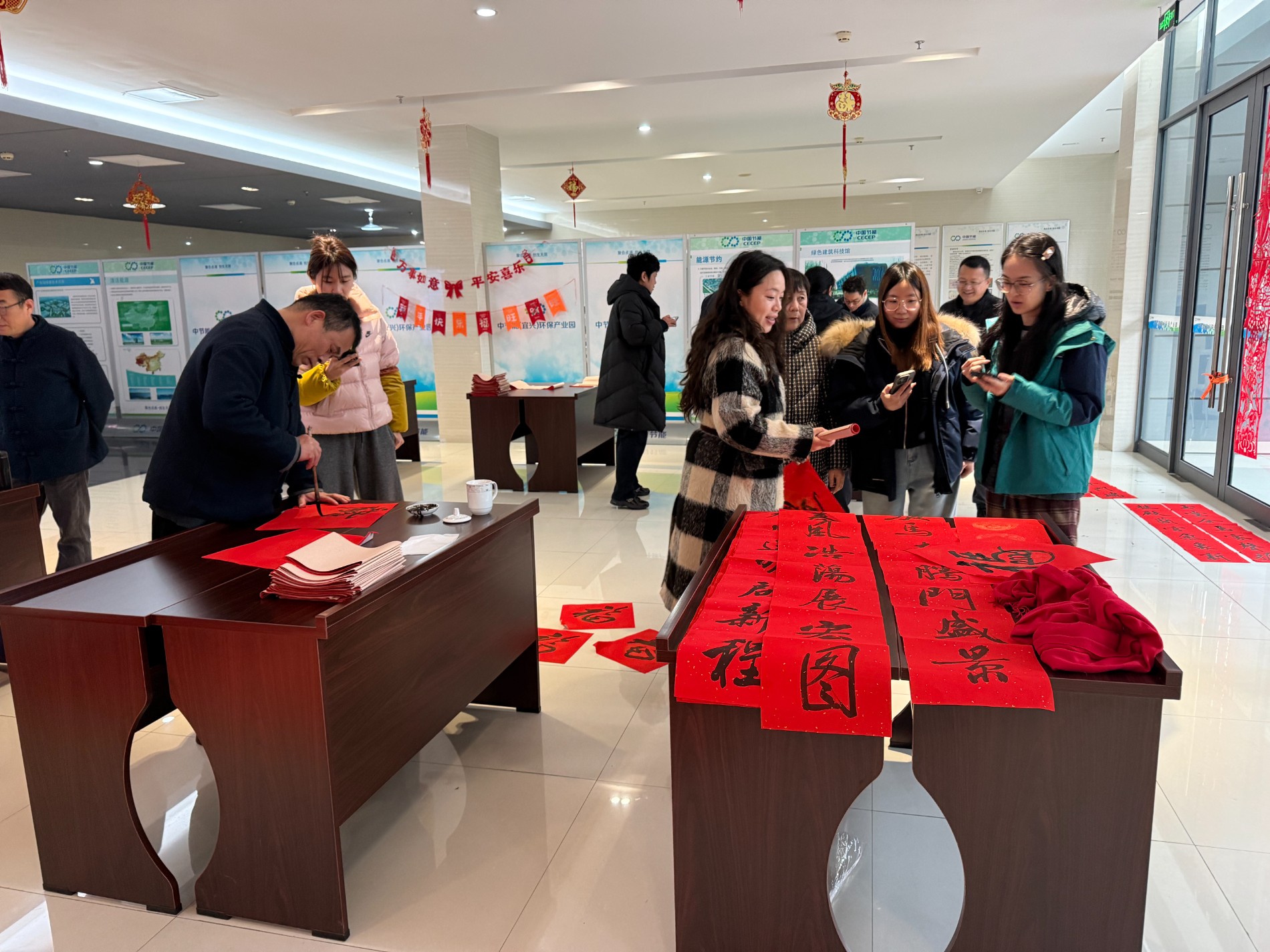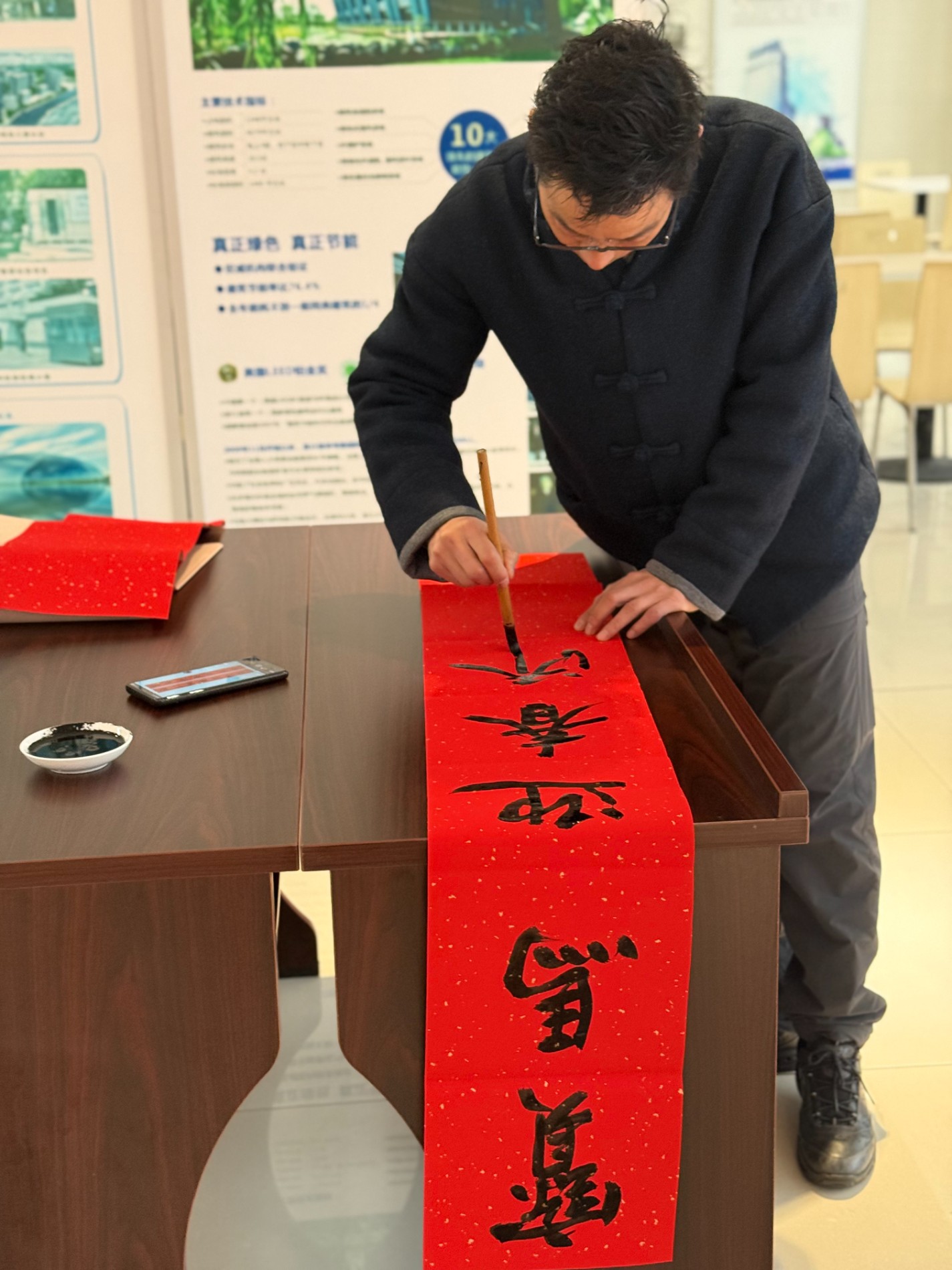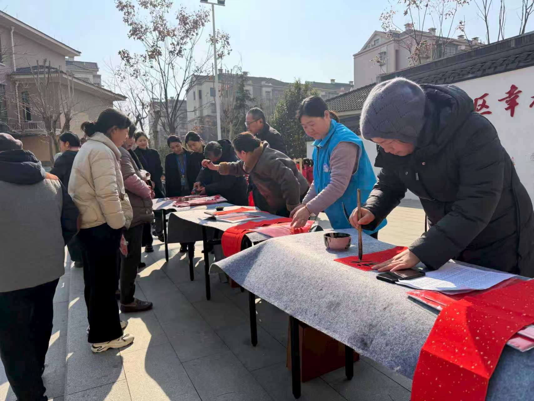 1月26日,宜兴分公司物业服务中心大厅暖意融融。一隅,工作人员早早准备腊八粥,热情地分发给前来参与的业主家人们。大家手捧热粥,笑意盈盈,品尝的是传统味道,感受的是邻里温情与物业贴心。另一隅,墨香四溢。特邀紫砂届书法老师挥毫泼墨,一幅幅承载着美好祝愿的春联和“福”字跃然纸上,为即将到来的新春增添了浓浓年味与喜庆色彩。