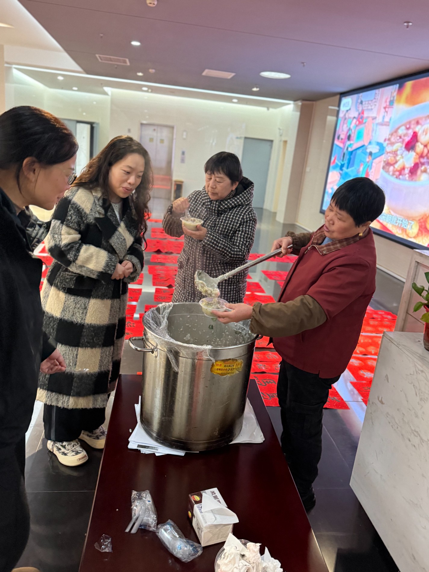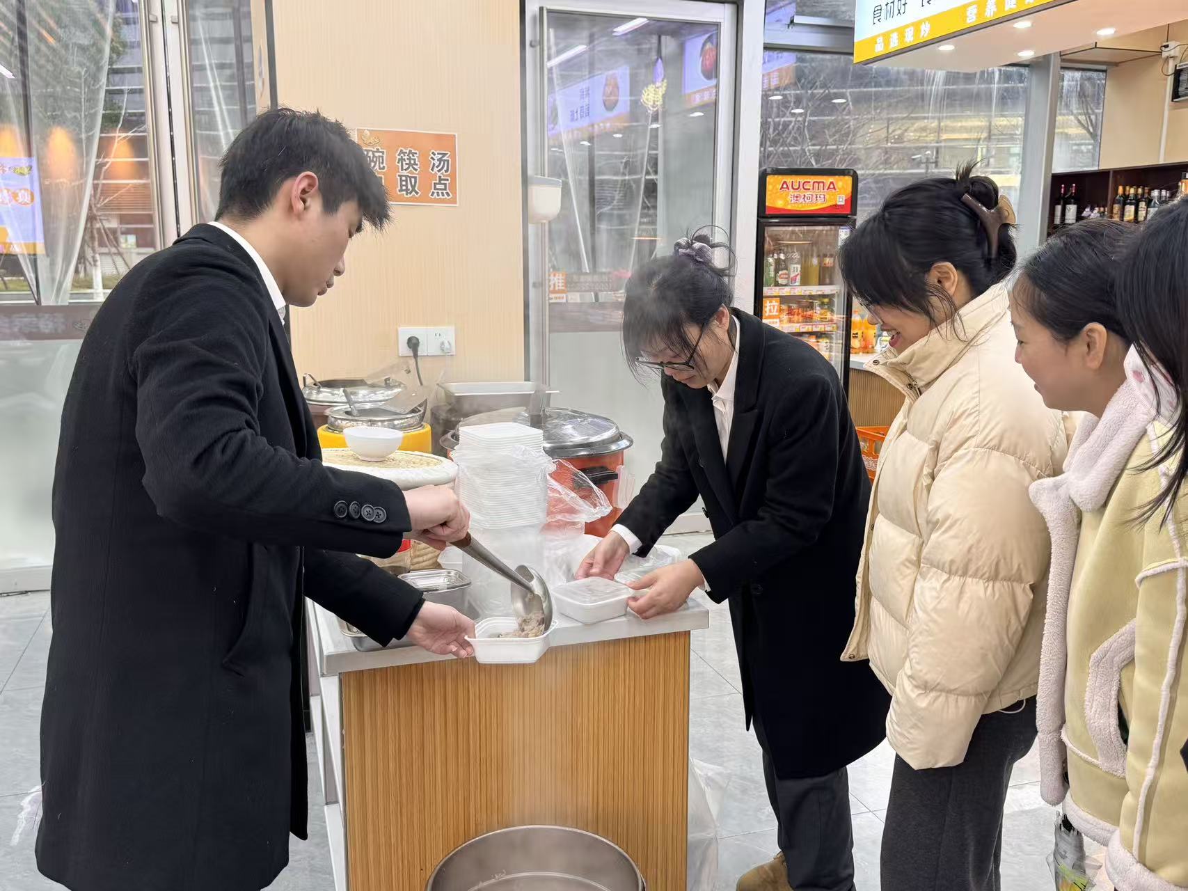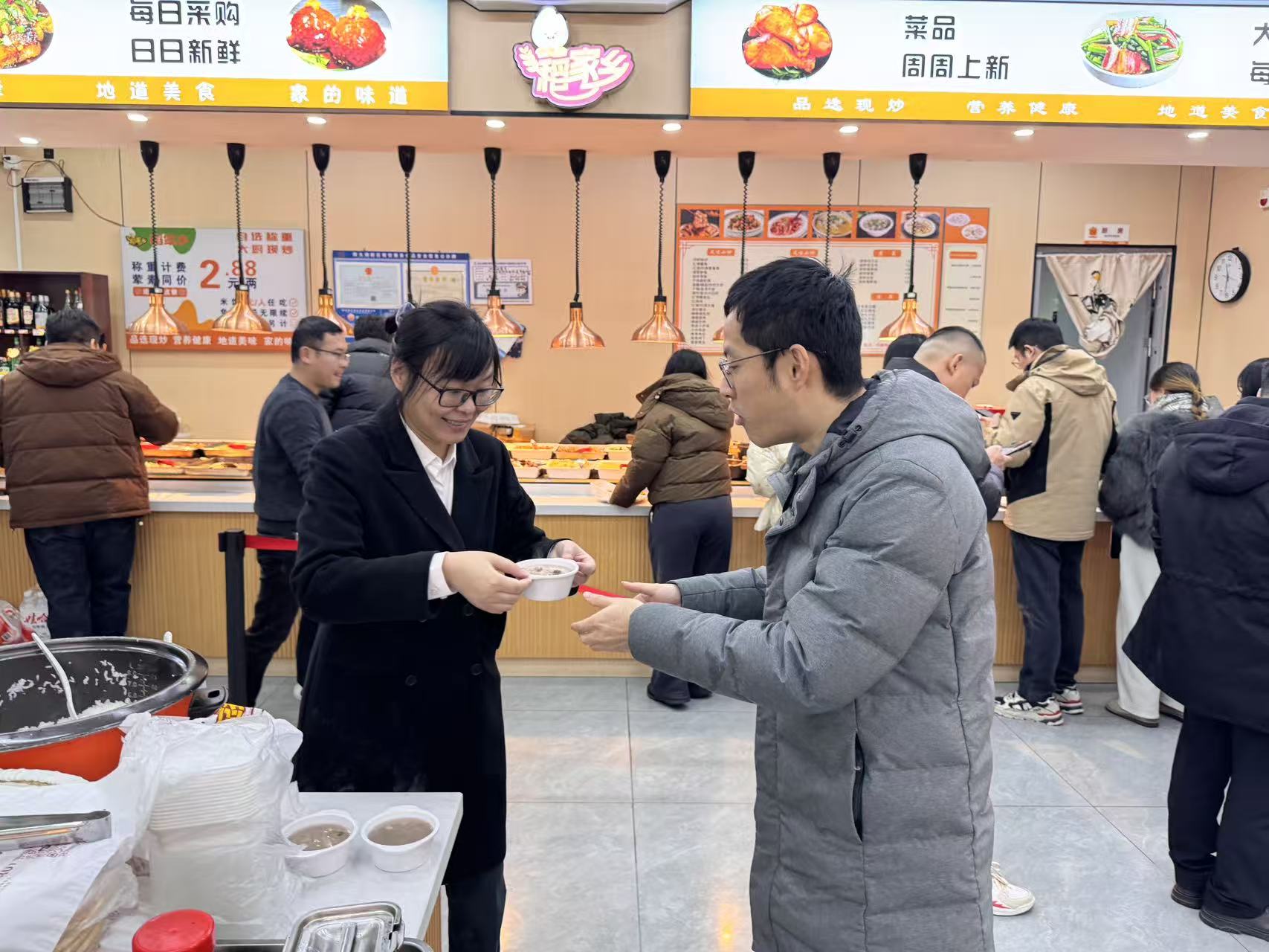 热粥甜香弥漫大堂,不少人放缓脚步,手捧粥碗笑意盈盈,品尝着传统滋味的同时与身旁同事轻声交谈。温暖的气息在冬日的早晨流动,连空气都变得柔和起来。