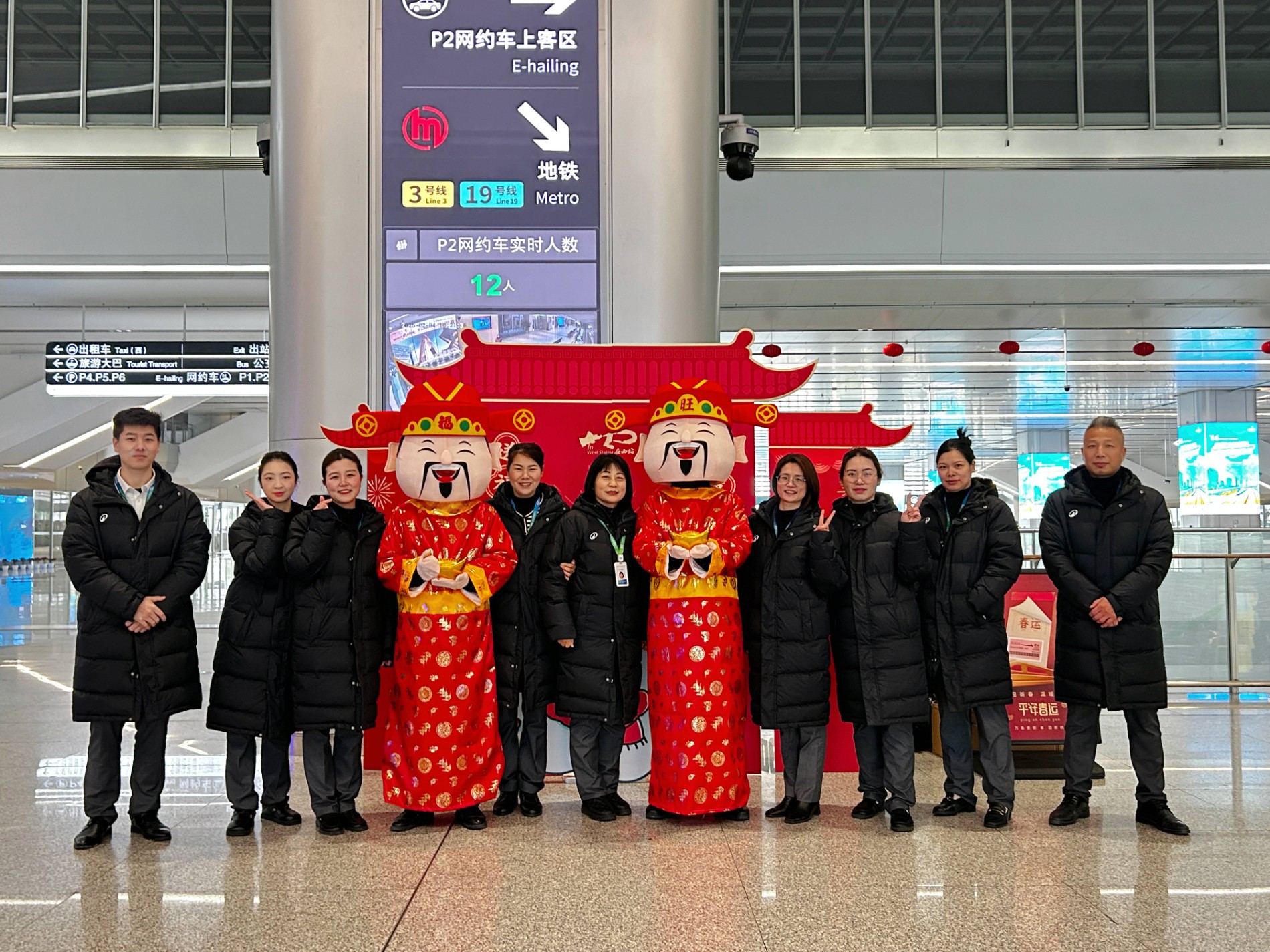杭州西站物业服务中心全面启动新春布置,工作人员安全悬挂朱红灯笼于人流密集区域,张贴“马上幸福”等卡通骏马主题窗贴,让旅客一出站便感受浓厚年味。2月4日立春,工作人员化身“财神”在站内派发径山对联,提供问询解答、合影定格等服务,为归乡旅客增添节日仪式感。