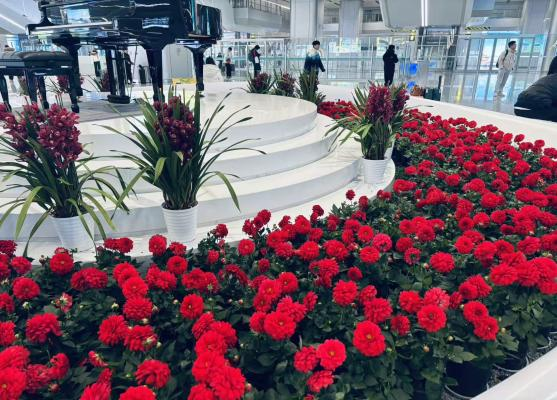 站房中庭高悬喜庆灯笼,北通廊陈列非遗红马,文化长廊点缀马年主题装饰,琴岛区域更换时花 530 余盆,更换大型花卉 20余盆,“零米层”10 个坐凳造景全部根据春节氛围进行了更新,将传统文化韵味与红色服务初心深度融合,打造出一道亮丽的“红色风景线”,让旅客在匆匆归途中切实感受到“家”的温暖与关怀。